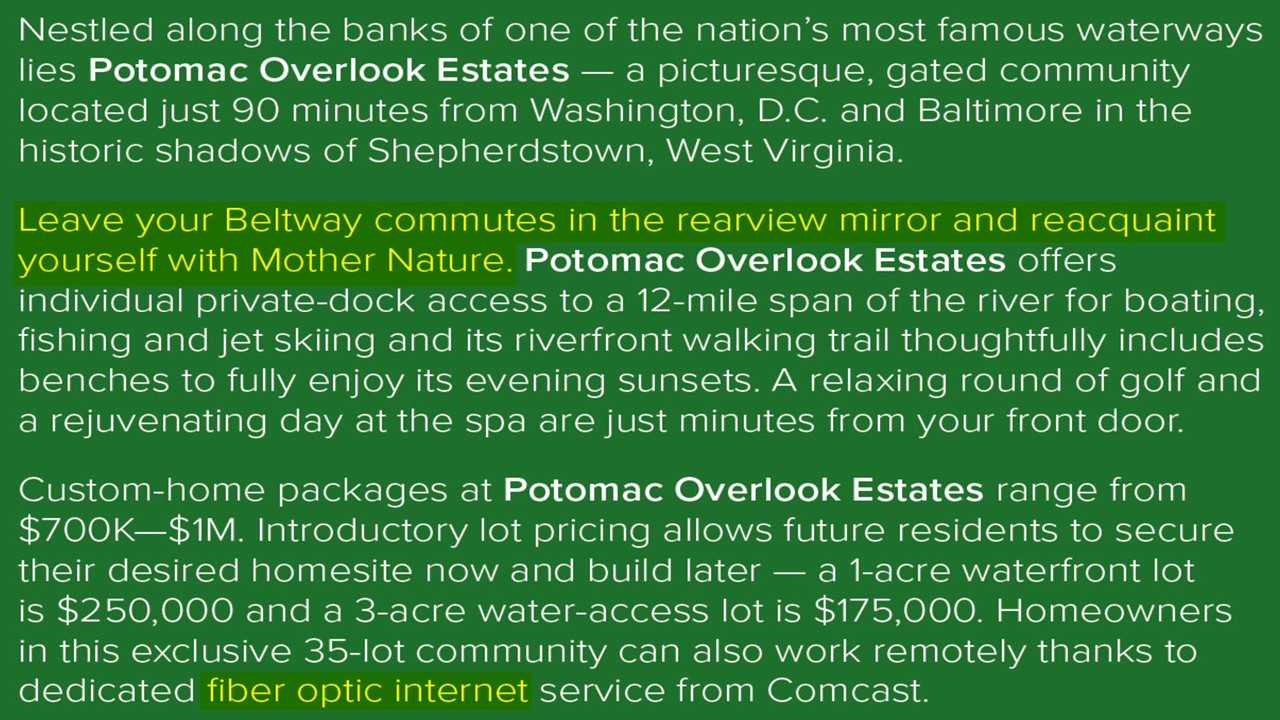 Nested along the banks of one of the nation's most famous waterways lies Potomac Overlook Estates -- a picturesque, upscale gated community located just 90 minutes from Washington, D.C. and Baltimore in the historic shadows of Shepherdstown, West Virginia.